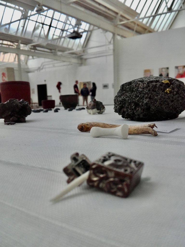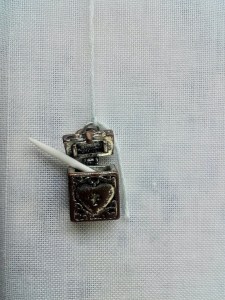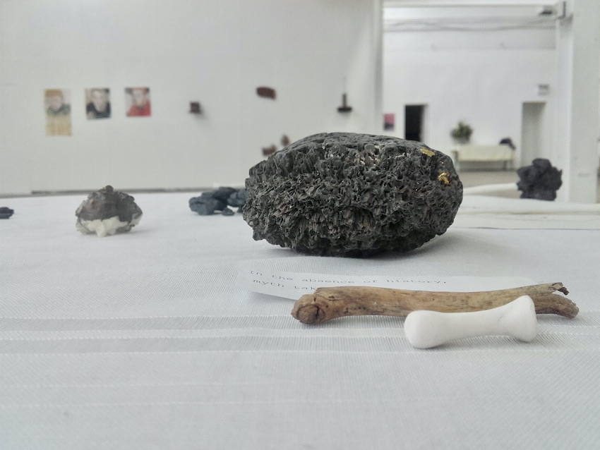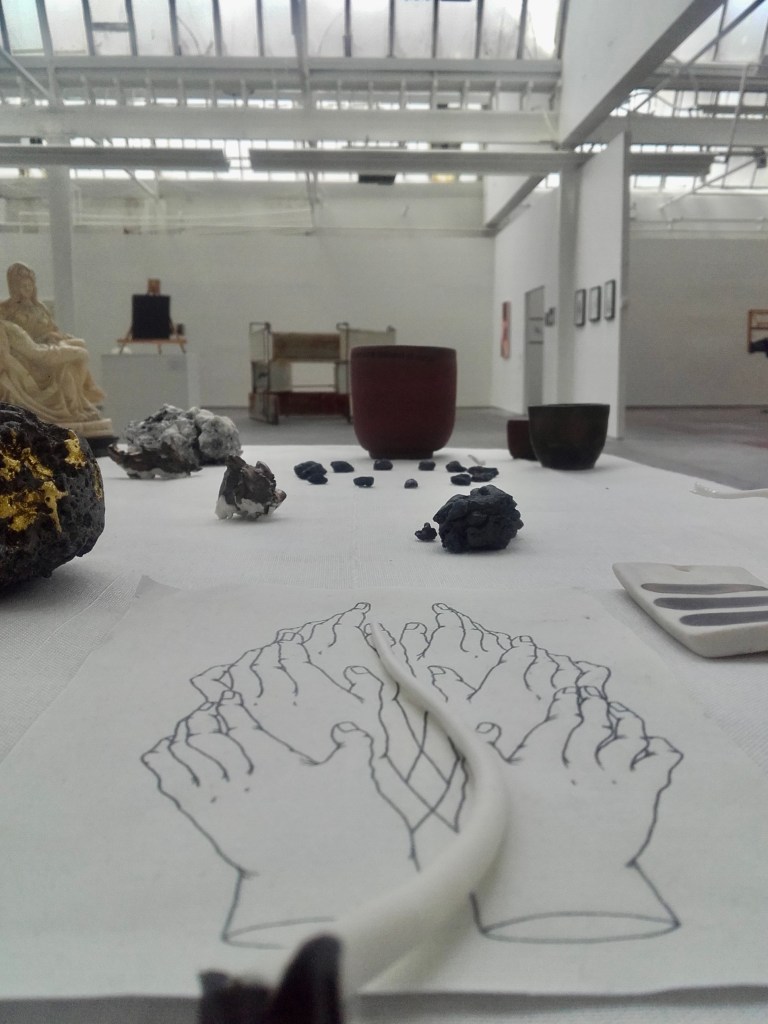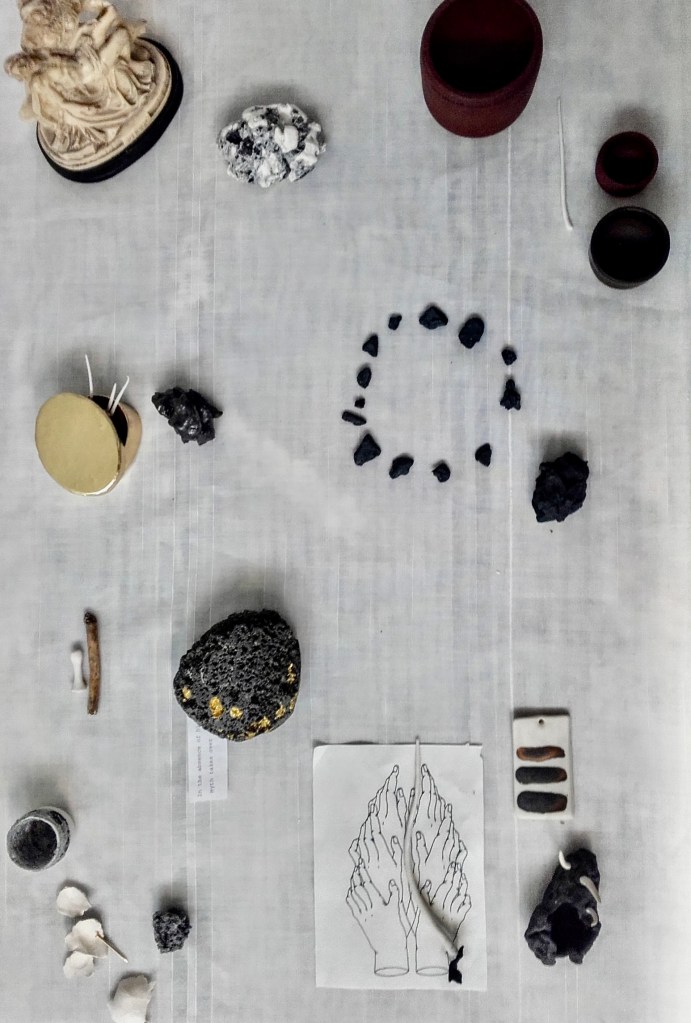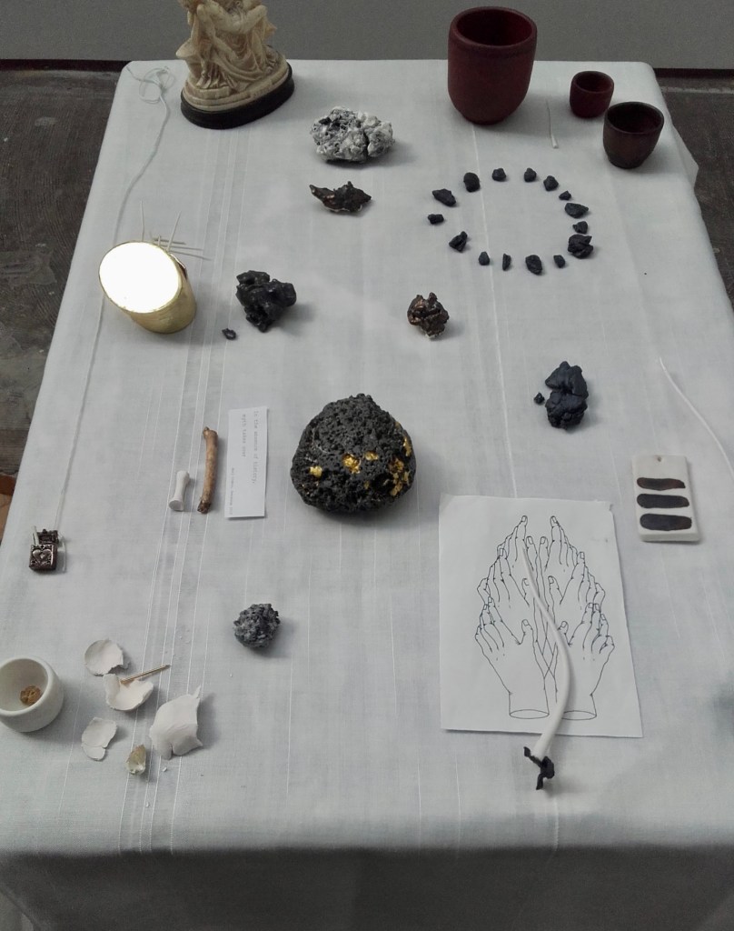 altar (2016) old school desk, tablecloth, religious statue, stick, rock, sterling silver locket, porcelain, terracotta